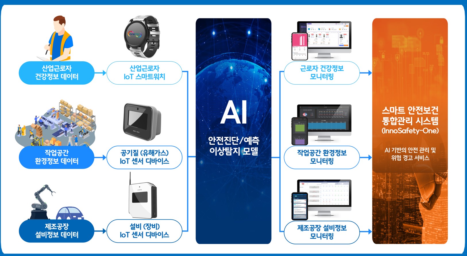 국문:이노메스는 AI와 IoT 기술을 기반으로 산업근로자의 건강정보, 작업공간의 환경정보, 제조설비 데이터를 스마트워치와 센서 디바이스를 통해 실시간 수집하고 AI 모델로 분석하여 이상 징후를 사전 예측하는 ‘InnoSafety-One’을 제공합니다. 이는 산업현장의 안전과 보건을 통합적으로 관리하는 스마트 시스템으로 위험 요소를 조기에 탐지하고 경고하여 안전사고를 예방하며 근로자의 건강 보호와 공정 효율 향상에 기여합니다.